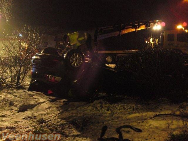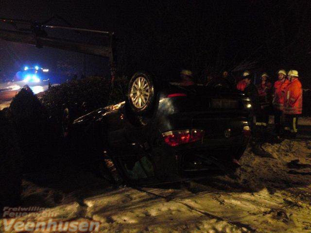 Der Wagen blieb in den Büschen eines Vorgartens auf dem Dach liegen. Nach ersten Meldungen, die in der Feuerwehr und Rettungsleitstelle eingingen war eine Person eingeklemmt und der Wagen hatte zu brennen angefangen. Die Feuerwehr Warsingsfehn und der Rettungwagen aus Hesel wurden alarmiert.