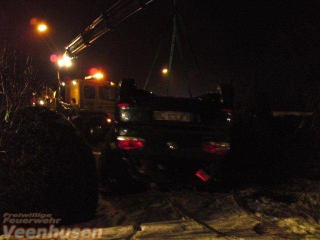 Zur Unterstützung rückte auch das Fahrzeug der Feuerwehr Veenhusen (nach dem Einsatz auf der Autobahn) mit an. Die Feuerwehr sicherte und leuchtete die Unfallstelle aus und unterstützte bei der Bergung des Fahrzeugs und den Aufräumarbeiten. Nach rund 90 Minuten war der Einsatz beendet.