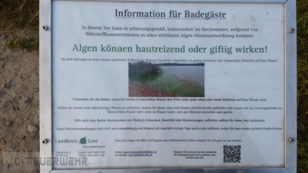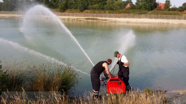 Auf Anfrage der Gemeinde rückten 12 Feuerwehrkameraden der Ortsfeuerwehr Veenhusen am Dienstag um ca. 17:45 Uhr mit einem Löschfahrzeug aus, um die Blaualgen im Badesee zu bekämpfen. Nachdem 2 Pumpen am See in Stellung gebracht waren, um das Wasser im See umzuwälzen wurde kurzerhand vom Gemeindebrandmeister Karsten Leerhoff zusätzlich noch das Löschgruppenfahrzeug der Feuerwehr Neermoor angefordert, um mit weiteren 2 Pumpen zu unterstützen. Das Wasser wurde aus dem See angesaugt und direkt wieder in den See zurückgeworfen. Die so entstehende Wasserzirkulation sollte dafür sorgen, dass der Sauerstoffgehalt des Wassers wieder ansteigt und sich somit die Blaualgen-Bakterien verringern.