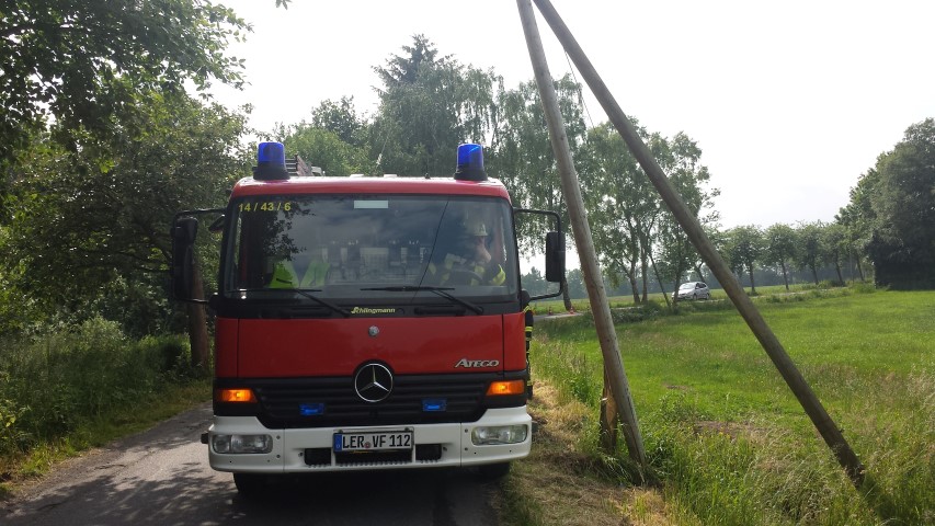 Am Sonntagnachmittag war es auf der Königsmoorstraße zu einem Verkehrsunfall gekommen, bei dem ein Fahrzeug von der Fahrbahn abgekommen und gegen einen Telefonmast geprallt war. Die Insassen wurden nicht verletzt. Der Telefonmast jedoch schwer beschädigt. Der Mast war gebrochen und drohte komplett auf die Fahrbahn zu stürzen. Zunächst wurde der Bauhof der Gemeinde Moormerland informiert, die nach Sichtung der Lage vor Ort die Feuerwehr nachforderte.