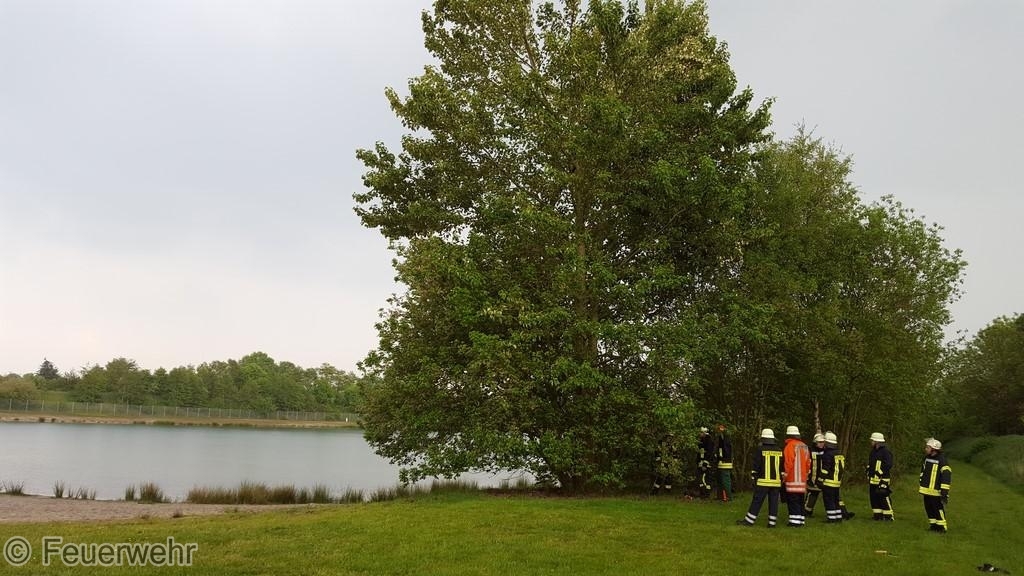 An einem Baum am Badesee war die Baumkrone abgebrochen und im Geäst hängen geblieben.