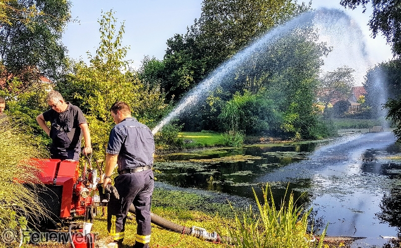 Am Dienstag den 24.07.18 fiel Anwohnern auf, dass im Regenrückhaltebecken zwischen den Strassen Torfring und Waterbank, die Fische an die Oberfläche kamen um Sauerstoff zu atmen.Die Anwohner meldeten Ihre Beobachtung daraufhin beim Bauamt der Gemeinde Moormerland. Zusammen mit dem Ortsbrandmeister Jörg Buss und Mitarbeiter der Gemeinde wurde kurz darauf vor Ort die Lage begutachtet. Es wurde dann entschieden, die Feuerwehr Veenhusen zu alarmieren, um zu versuchen durch das Umwälzen des Wassers den Sauerstoffgehalt im Wasser aufzubessern.