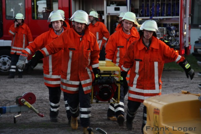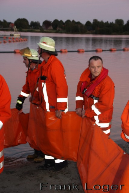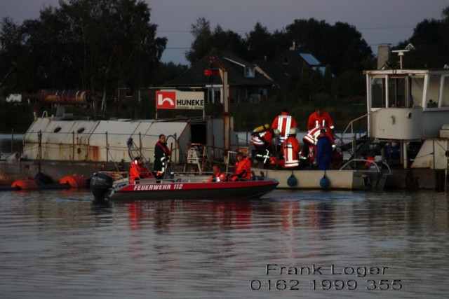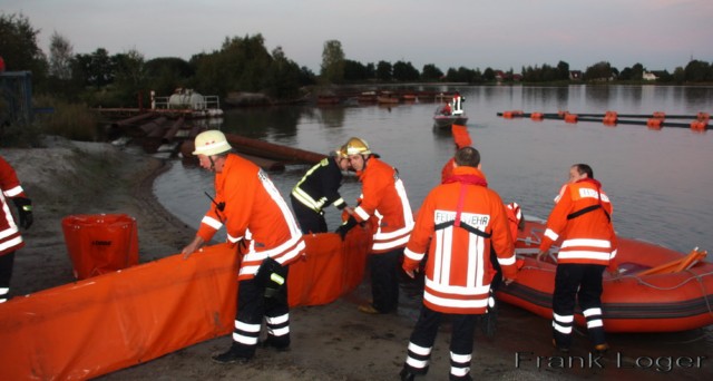 Das Szenario: >>Es brennt ein Saugbagger der Firma Huneke, auf dem sich noch eine Person befindet und zudem ist eine unbekannte Menge Diesel ausgetreten.<<