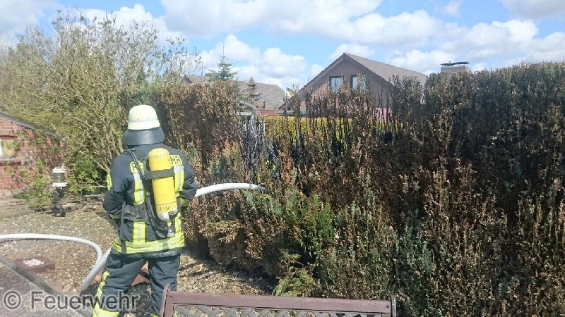 Bereits wenige Minuten später waren die ersten Kräfte vor Ort. Das Feuer hatte die Tuja Hecke auf rund 10 Meter Länge erfasst. Die Flammen waren dann aber schnell abgelöscht.