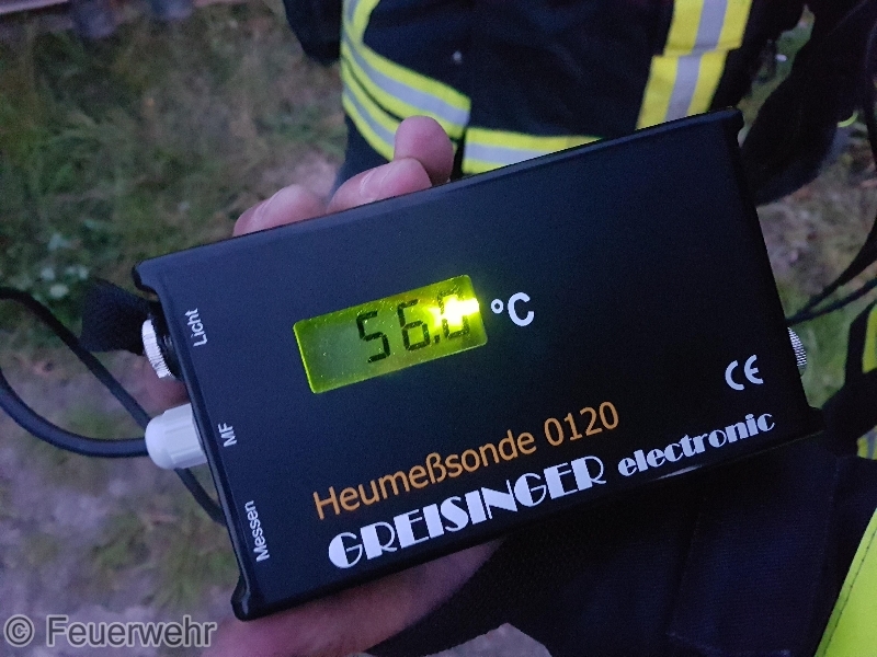 Bei einer weiteren Messung in einem benachbarten Betrieb, wurden Temperaturen um die 65 Grad gemessen. Dem Landwirt wurde angewiesen, die Strohballen ins Freie zu fahren, so das es bei einer eventuellen Selbstentzündung nicht zu einem Gebäudeschaden kommen könnte.